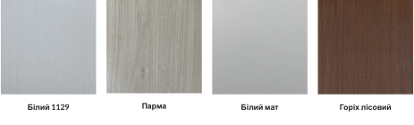 шведська вишня, астана мерле, біле дерево, філадельфія крем, карпатська ялина, горіх темний, горіх лісовий, астана розвуд, дуб шале графіт, білий мат, парма, айворі, білий 1129